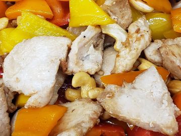 Delicious stir-fried chicken, onion, red and green pepper, palm sugar, chilies in a home made stir fry sauce topped with cashew nuts. This dish is available as Vegan/Vegetarian with tofu as the protein.